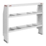 Adjustable cargo van shelving units help maximize van storage customization and capacity. The Model 9355-3-03 adjustable shelf unit includes 3 shelves and measures 44 inches high by 52 inches wide by 13.5 inches deep with a 10.5-inch deep top shelf when assembled. The adjustable work van shelving is deeper to hold more tools and equipment and has captive nuts at each corner for easier assembly and quieter operation. Accessory mounting holes in the commercial van shelving eliminates the need for mounting brackets or drilling. The shelving for vans is manufactured of heavy gauge steel and fully hemmed for extra strength and durability. The adjustable van shelving includes two tapered end panels and a set of four adjustable dividers for each shelf.