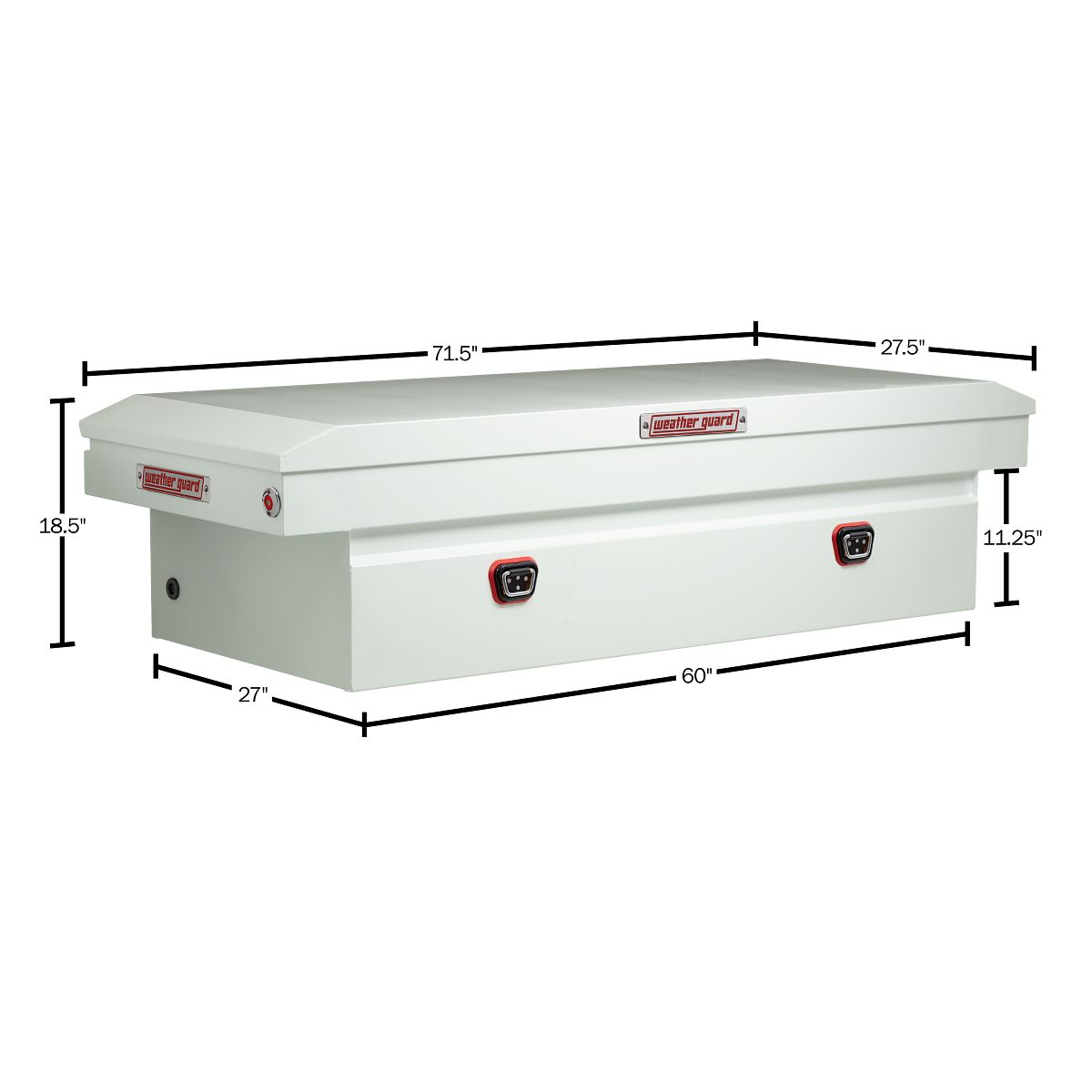 The new WEATHER GUARD 1KEY Ultralock is the next advancement in truck box security. The Ultralock combines one key simplicity with detent technology, providing quick visual assurance your gear is locked down and protected. The box features the new push button lock that can code multiple boxes on a truck or entire fleet to the same key. The Model 116-3-04 is an extra wide steel truck toolbox and has a storage capacity of 15.5 cubic feet. It is coated with a White ARMOR TUF® Powder Coat finish ensuring years of dependability.