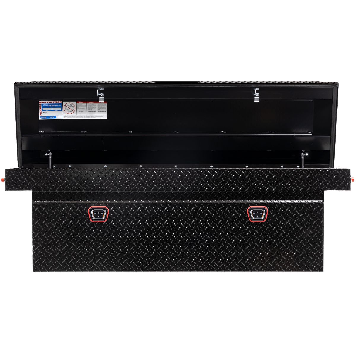 The new WEATHER GUARD 1KEY Ultralock is the next advancement in truck box security. The Ultralock combines one key simplicity with detent technology, providing quick visual assurance your gear is locked down and protected. The box features the new push button lock that can code multiple boxes on a truck or entire fleet to the same key. The Model 123-5-04 is a deep aluminum truck toolbox and has a storage capacity of 15.0 cubic feet. It is coated with a Gloss Black ARMOR TUF® Powder Coat finish ensuring years of dependability.