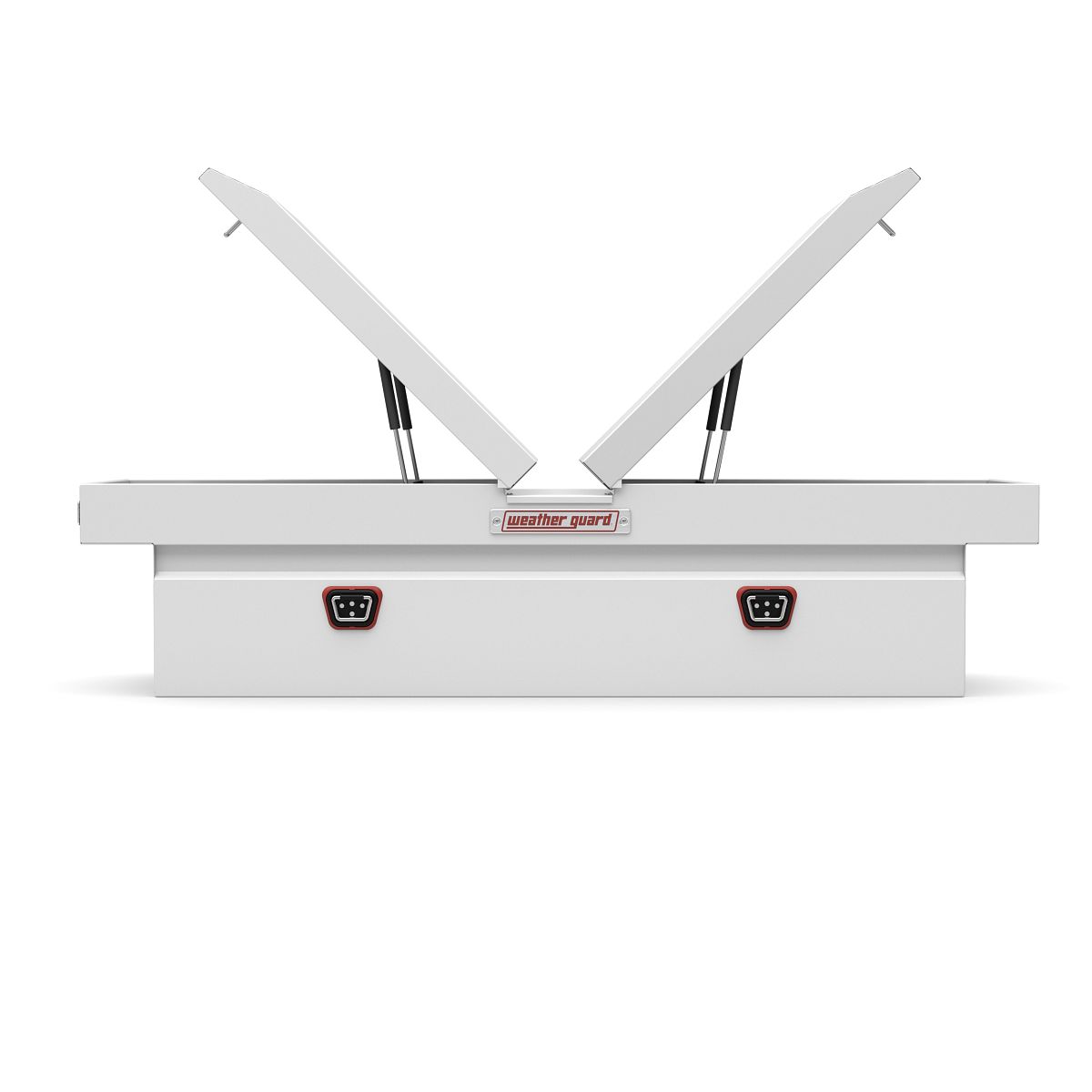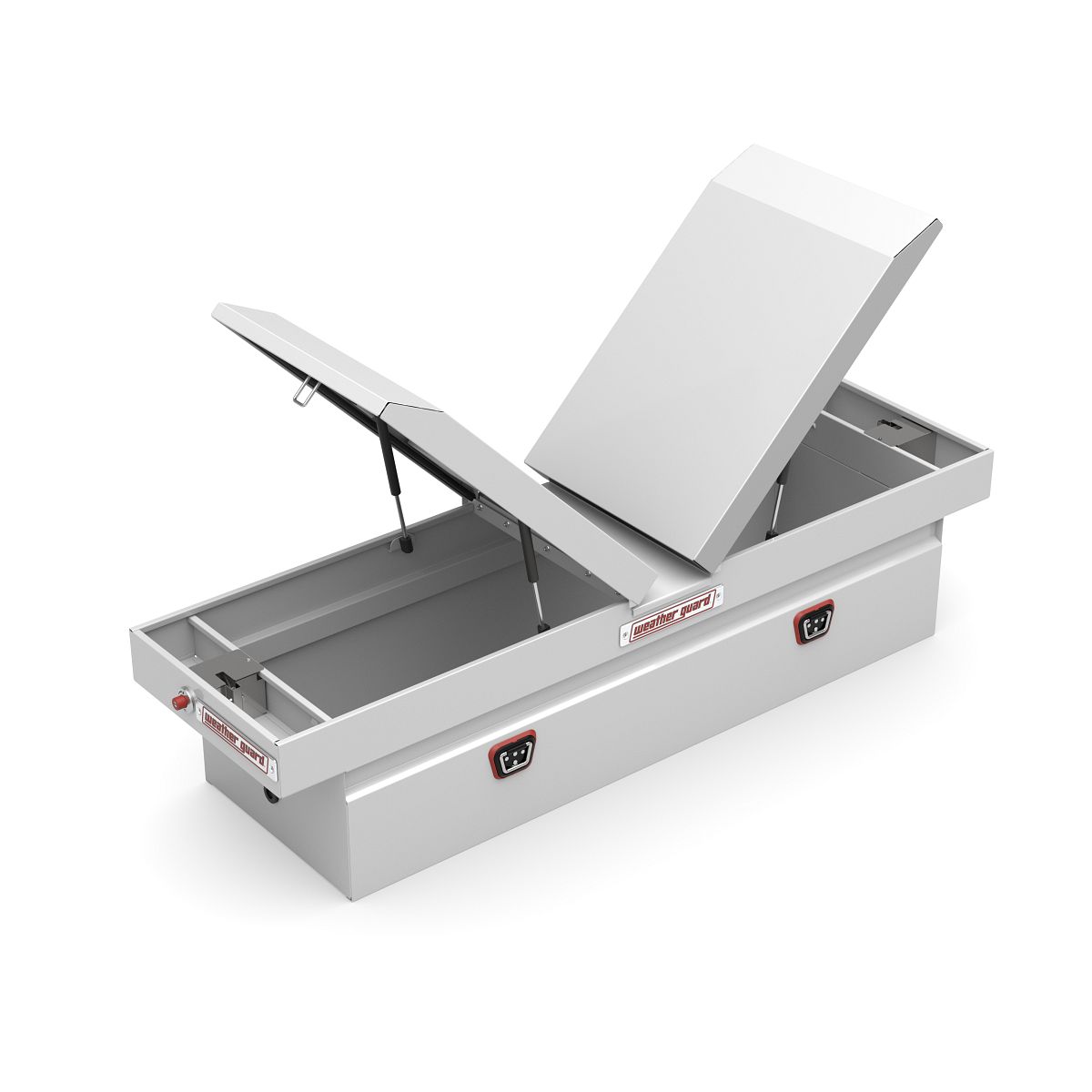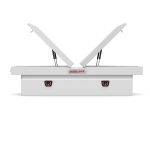 Gull Wing Tool Boxes allow access from either side of the truck with two independently locking lids. The Model 125-3-04 is a steel gull wing truck tool box for full size trucks and has a storage capacity of 11.3 cu ft. The White ARMOR TUF® Powder Coat finish ensures years of dependability. This rugged, versatile crossover truck tool box has a full weather seal to keep out the elements.