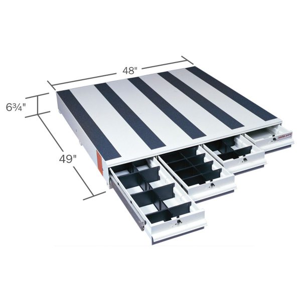 This lightweight, aluminum, enclosed truck bed and cargo van solution conveniently increases your storage space and places small equipment at your fingertips. The Model 326-3 is a quad lateral drawer unit measuring 49 inches long by 48 inches wide by 6.75 inches high. The slide out truck bed tool box and cargo van tool box drawer dividers provide an extensive array of options for organization.