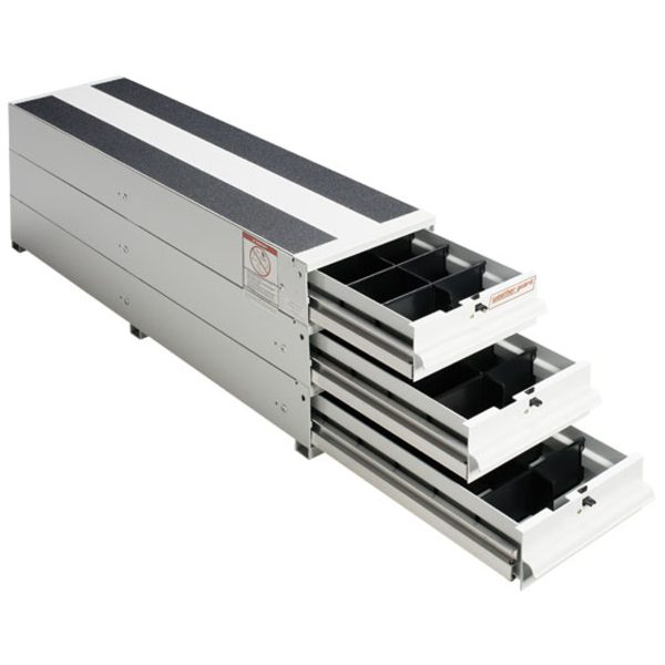 This lightweight, aluminum, enclosed truck bed and cargo van solution conveniently increases your storage space and places small equipment at your fingertips. The Model 327-3 is a triple stacked drawer unit measuring 49 inches long by 12.25 inches wide by 17.75 inches high. The slide out truck bed tool box and cargo van tool box drawer dividers provide an extensive array of options for organization.