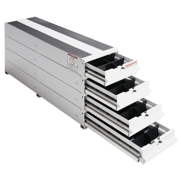 This lightweight, aluminum, enclosed truck bed and cargo van solution conveniently increases your storage space and places small equipment at your fingertips. The Model 328-3 is a quadruple stacked drawer unit measuring 49 inches long by 12.25 inches wide by 23.5 inches high. The slide-out truck bed tool box and cargo van tool box drawer dividers provide an extensive array of options for organization.
