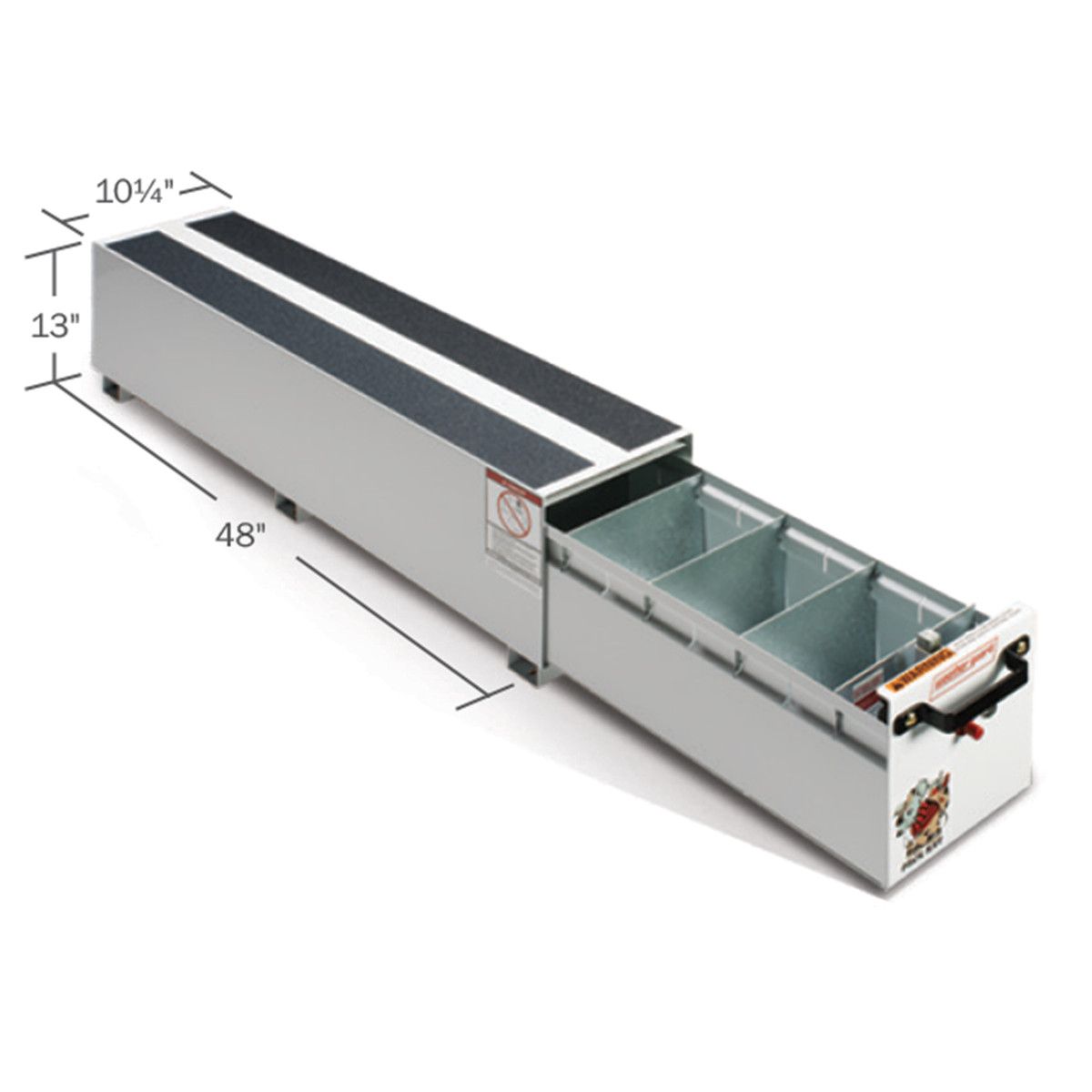Heavy-duty pull out truck bed storage keeps bed space open and supplies organized. The Model 335-3 steel Pack Rat Standard Drawer Unit for truck bed storage and cargo van storage has 1 compartment with 6 dividers. The slide out truck bed tool box and cargo van tool box has a roll-out drawer load rating of 425 pounds, evenly distributed. The steel top and sides have a load rating of 750 pounds, evenly distributed. This truck bed storage and cargo van storage unit can be mounted inside the rear of the vehicle to provide easy access to large tools and supplies while leaving floor space open.