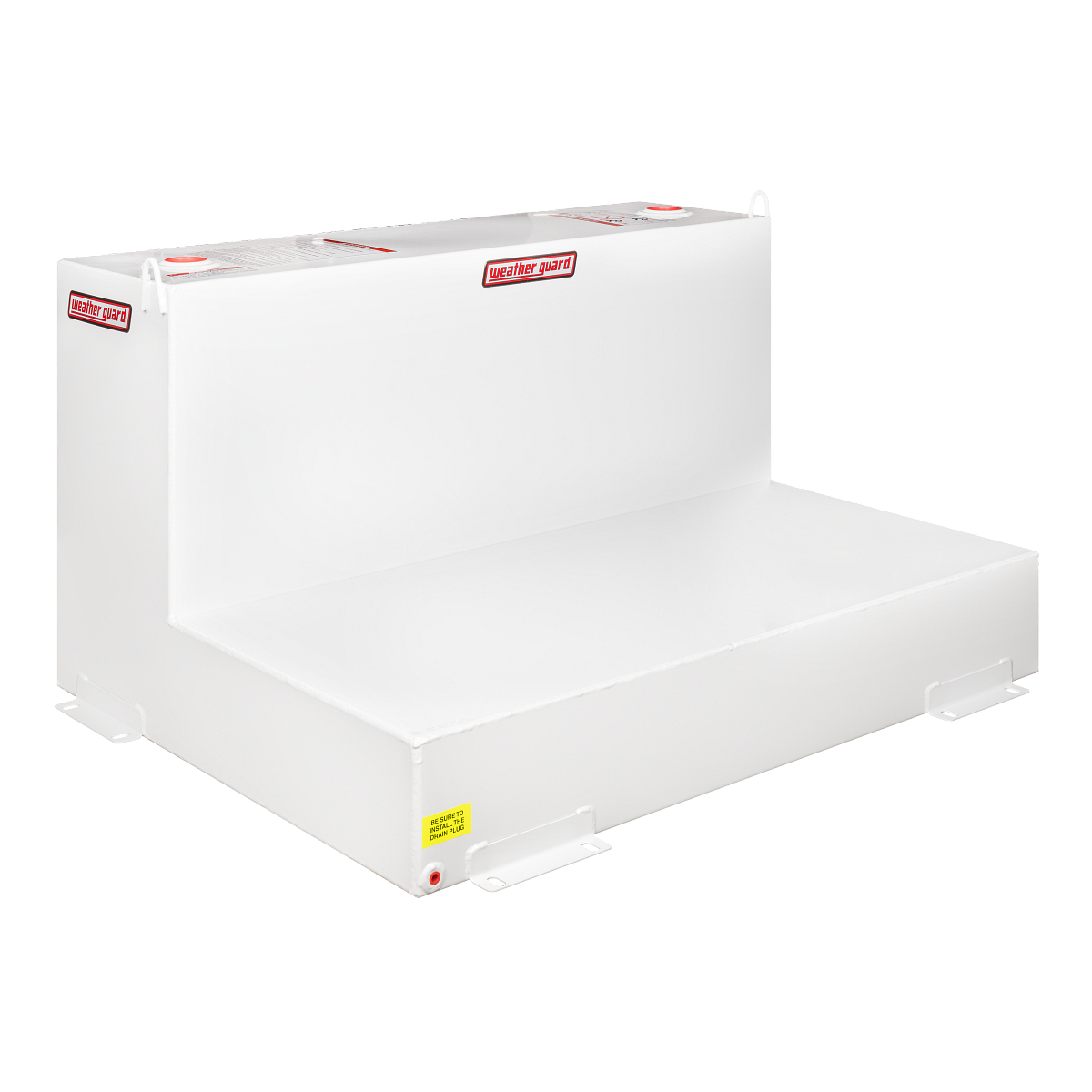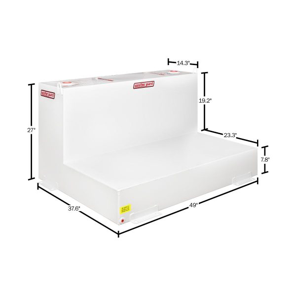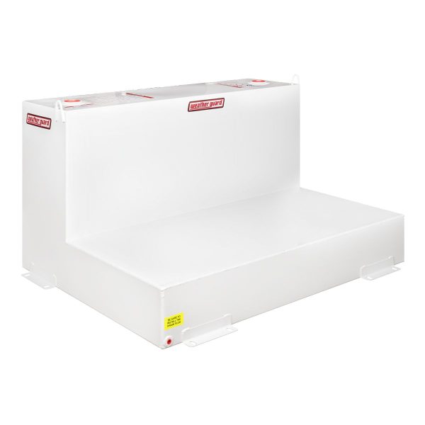 Limit your back and forth travel with a fuel Steel Transfer Tank that can handle large loads, like the WEATHER GUARD Model 362-3-02 Steel Transfer Tank, L-Shape, 110-gallon. This L-shaped fuel tank comes in a Brite White ARMOR TUF® Powder Coat finish and fits many full-size pickup trucks loaded with a Gull Wing Box or Saddle Box. Use this truck fuel Steel Transfer Tank for either diesel fuel or hydraulic fluid.