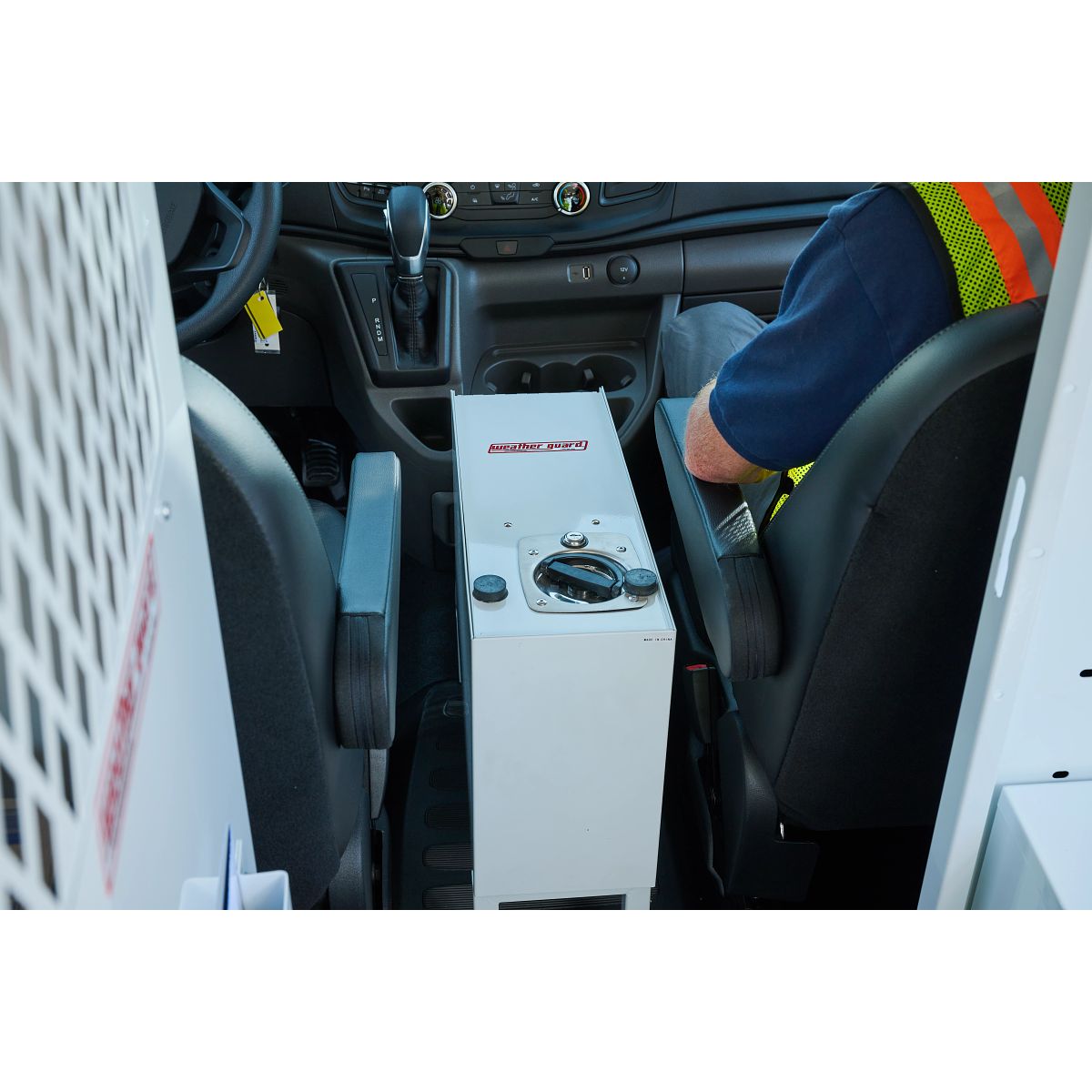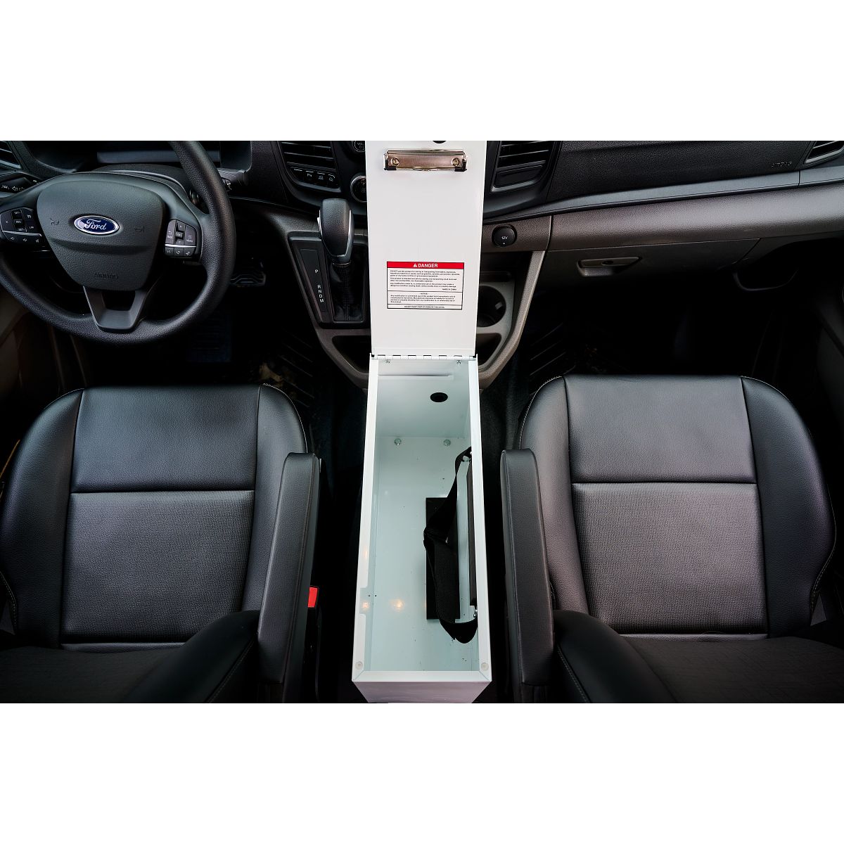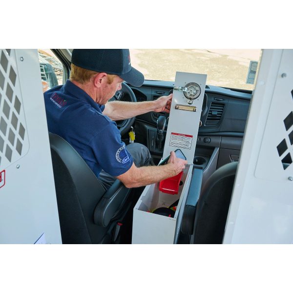 The Model 9012-3-01 Cab Command Center provides between-seat cargo van storage with room for a laptop and hanging files and features a handy clip board lid. The POWER PASS® electrical pass-thru grommet helps keep everything charged while on the road. The D-Handle lock on the van storage cabinet keeps everything safe on the job. The easy-to-release interior latch on the work van center console lets you take it out when you need it. This work van accessory measures 13in wide.