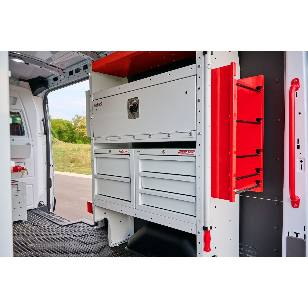 Add extra security and theft-resistance for valuable tools and equipment with the Model 9045-3-03 Secure Storage Module Kit containing a two drawer and a three drawer lockable cabinet. Each drawer on the cargo van storage unit securely latches to stay closed even when the cabinet is unlocked. Measuring 42 inches wide, 17 inches high and 16 inches deep, the welded steel construction and heavy-duty locking mechanism ensures peace of mind on the job or in the parking lot. NOTE: Model 9045-3-03 is a storage kit that includes (1) 902-3-01 and (1) 903-3-01 and is designed to mount to standard 16-inch deep shelving.