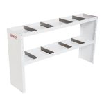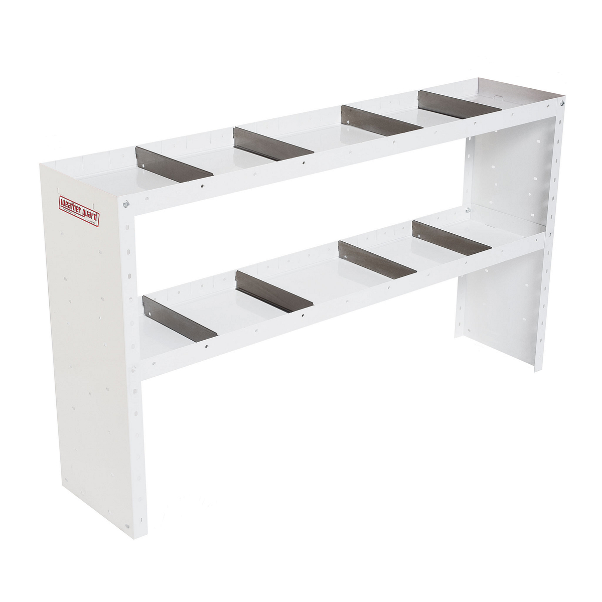 Heavy duty adjustable cargo van shelving units help maximize van storage customization and capacity. The Model 9336-3-03 shelf unit includes 2 shelves and measures 34 inches high by 60 inches wide by 13.5 inches deep when assembled. The adjustable work van shelving is deeper to hold more tools and equipment and has captive nuts at each corner for easier assembly and quieter operation. Accessory mounting holes in the commercial van shelving eliminates the need for mounting brackets or drilling. The shelving for vans is manufactured of heavy gauge steel and fully hemmed for extra strength and durability. The van shelving includes two square-backed end panels, mounting hardware and a set of four adjustable dividers for each shelf.