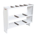Heavy-duty adjustable cargo van shelving units help maximize van storage customization and capacity. The Model 9345-3-03 shelf unit includes 3 shelves and measures 44 inches high by 52 inches wide by 16 inches deep with a 13.5-inch deep top shelf when assembled. The adjustable work van shelving has captive nuts at each corner for easier assembly and quieter operation. Accessory mounting holes in the commercial van shelving eliminate the need for mounting brackets or drilling. The shelving for vans is manufactured of heavy gauge steel and fully hemmed for extra strength and durability. Two tapered end panels with notched bases maximize floor clearance for van drawer storage units or supplies. The van shelving includes mounting hardware and a set of four adjustable dividers for each shelf.