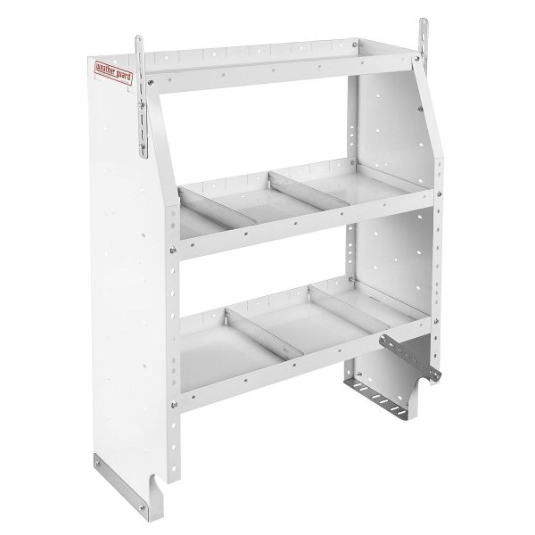 Adjustable cargo van shelving units help maximize van storage customization and capacity. The Model 9353-3-03 adjustable shelf unit includes 3 shelves and measures 44 inches high by 36 inches wide by 13.5 inches deep with a 10.5-inch deep top shelf when assembled. The adjustable work van shelving is deeper to hold more tools and equipment and has captive nuts at each corner for easier assembly and quieter operation. Accessory mounting holes in the commercial van shelving eliminates the need for mounting brackets or drilling. The shelving for vans is manufactured of heavy gauge steel and fully hemmed for extra strength and durability. The adjustable van shelving includes two tapered end panels and a set of four adjustable dividers for each shelf.