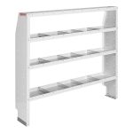 Adjustable van shelving units help maximize van storage customization and capacity. Model 9376-3-03 includes 4 shelves and measures 60in high, 60 inches wide by 13.5 inches deep with a 10.5-inch deep top shelf when assembled. New design adjustable shelves are deeper to hold more tools and equipment and have captive nuts at each corner for easier assembly and quieter operation. Accessory mounting holes in the shelves eliminate the need for mounting brackets or drilling. Manufactured of heavy gauge steel and fully hemmed for extra strength and durability. Includes two tapered end panels and a set of four adjustable dividers for each shelf.