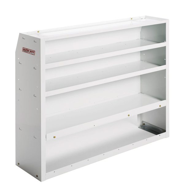 Fully arc-welded EZ-Cube van shelving is pre-assembled and ready to install. The Model 9452-3-01 shelf unit includes four welded shelves and measures 42 inches high by 51 inches wide by 14 inches deep with tapered end panels.. The cargo van shelving features heavy-gauge steel construction with a Brite White ARMOR TUF® Powder Coat finish to ensure years of durability and a professional appearance. EZ-Cube van storage accessories include additional shelf dividers and shelf doors.