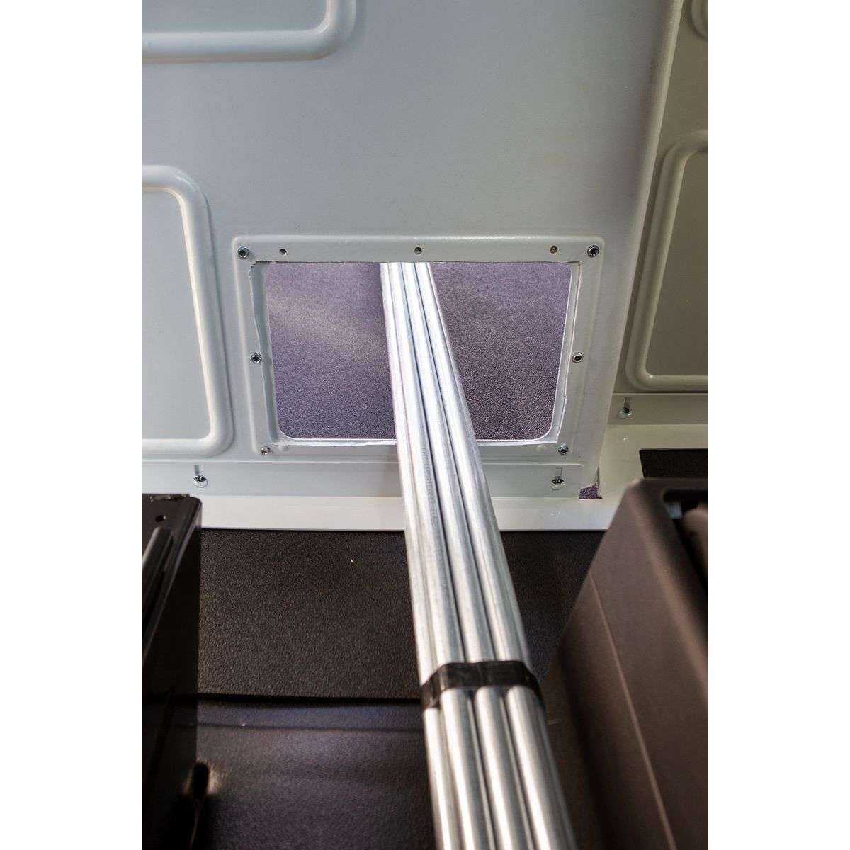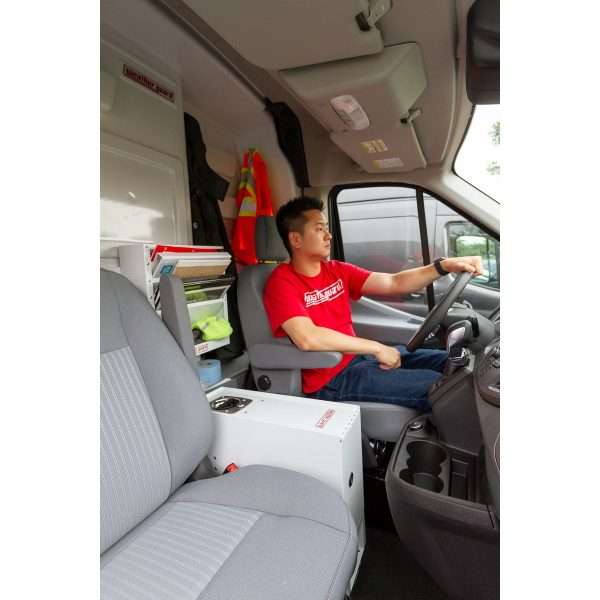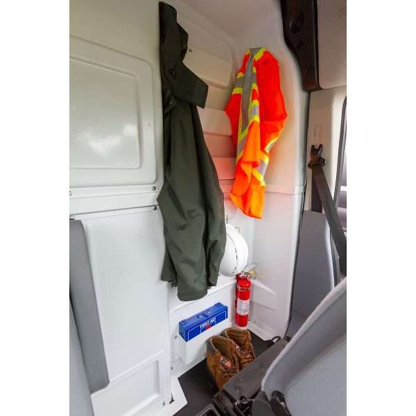 The Model 96310-3-01 CabMax™ composite bulkhead is a single-piece, composite van bulkhead designed for Ford Transit full-size vans. It fits Mid-Roof vans and can be the base for High-roof vans. The single-piece cargo van partition provides separation from the driver compartment and storage area, protecting the driver against shifting loads. The innovative profile design on the cargo van divider provides increased space in the cab, allowing for improved driver comfort and storage space. The tight fit provides improved climate control and noise reduction. The floating floor angle on the cargo van bulkhead adjusts accordingly for all van floor types. With no drilling into the floor, the potential for mishaps is virtually eliminated. Van window accessories are available for sight lines to the back and side of the van. Organization accessory panels can be placed in multiple locations for the customization of cargo van storage solutions.